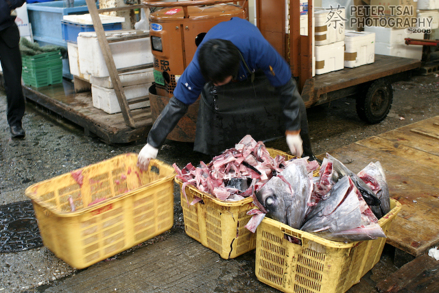 A fish monger slides fish scraps around in the early morning at the Tsukiji Fish Market. (stock image available)